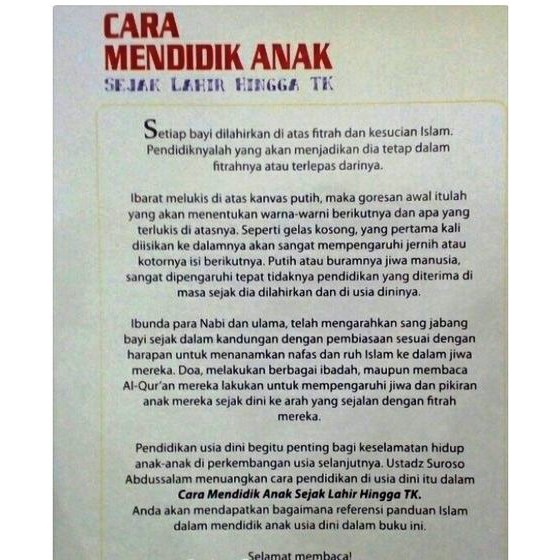Para ulama dalam hal ini bersepakat bahwa yang dimaksud dengan fitrah dalam ayat ini adalah islam. Serta dalam hadits yang terkenal, rasulullah shallallahu 'alaihi wa sallam bersabda kepada . Generasi terbaik umat ini dalam mencetak ulama dan pemimpin umat. Sebetulnya dalam ihya itu banyak sekali, ada enam belas materi mengenai anjuran dan juga cara mendidik anak. Syaikh abu hamid al ghazali ketika membahas tentang peran kedua